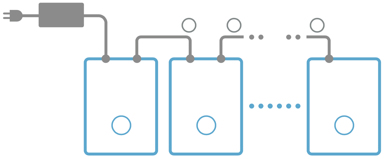 В большинстве банков крови многие сепараторы плазмы используются вместе. Поскольку каждый сепаратор должен использовать адаптер питания, пользователям необходимо подготовить одинаковое количество настенных розеток или адаптеров с несколькими ответвлениями. Чтобы уменьшить количество розеток переменного тока, которые необходимо подготовить, до пяти единиц сепараторов можно запитать от одного адаптера питания с использованием соединительных кабелей.