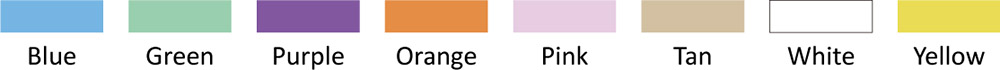Цвет: синий, зеленый, фиолетовый, оранжевый, розовый, бежевый, белый, желтый