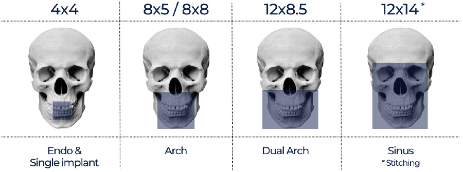 Поддержка пяти типов FOV от 4×4 до 12×8.5 см, а также возможность получения изображения 12×14 см с помощью функции двойного сканирования для полной диагностики зубной дуги и ВНЧС.